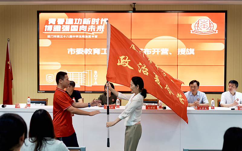 开营式在全体奏唱国歌中拉开帷幕,市委教育工委副书记施琦婷宣布夏令营开营并为夏令营授旗,由学生大队长接旗。