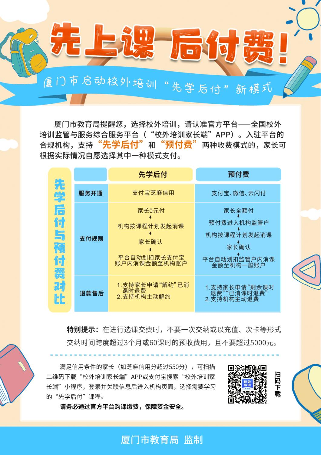为深入贯彻落实中央“双减”政策和我市城市综合信用工作要求,我局不断优化全国校外培训监管与服务综合平台(以下简称“全国监管平台”)功能,积极推广校外培训“先学后付”信用服务模式,筑牢资金“安全墙”,切实保护学生家长合法权益,打造清朗和谐的校外培训环境。