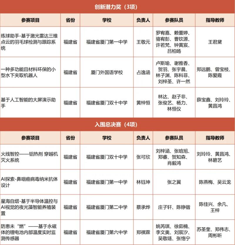 近日,中国国际大学生创新大赛(2025)萌芽赛道全国评选结果揭晓,我市高中学生在本次大赛中取得获奖数量全国第二的新突破,厦门一中、双十中学、外国语学校的3个项目获一等奖(全国20个一等奖,福建省获4个一等奖);厦门一中、双十中学、厦门二中、厦门六中等4个项目获二等奖(全国180个,福建省获6个一等奖),获奖项目覆盖人工智能、生物科技、新能源安全等领域,紧扣前沿、贴合实际,展现出厦门学子强劲的创新实力和扎实的科学素养。