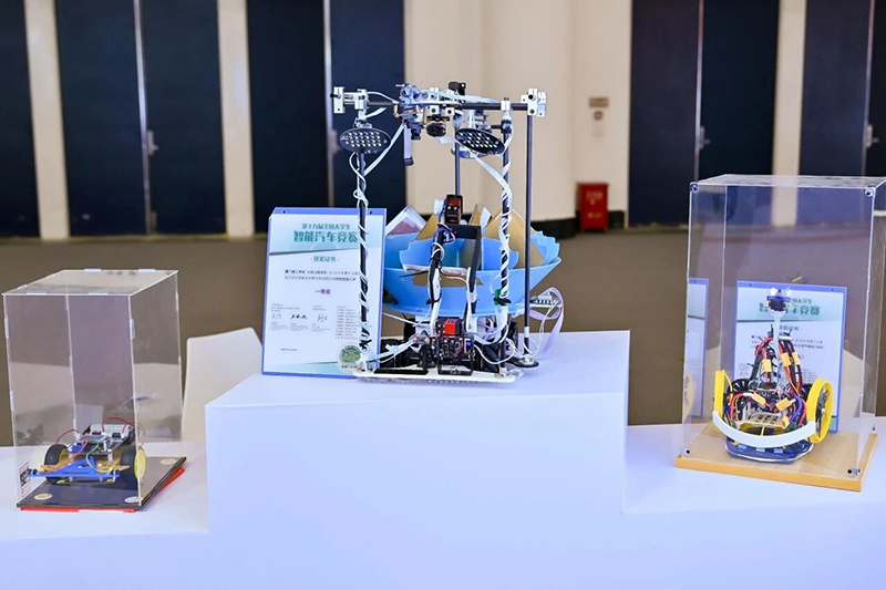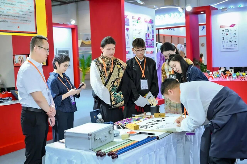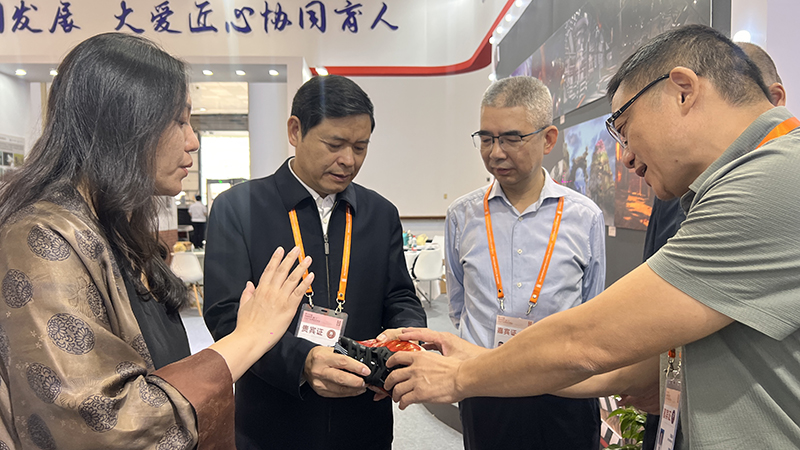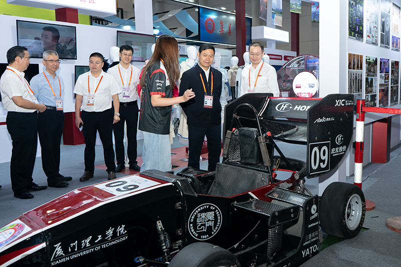 开幕式当天,省教育厅二级巡视员何光辉、市教育局副局长洪军等领导亲临高校展区与师生亲切交流,详细了解作品背后的创作理念,并对展区呈现的 “文创+科技”融合特色给予高度评价。
